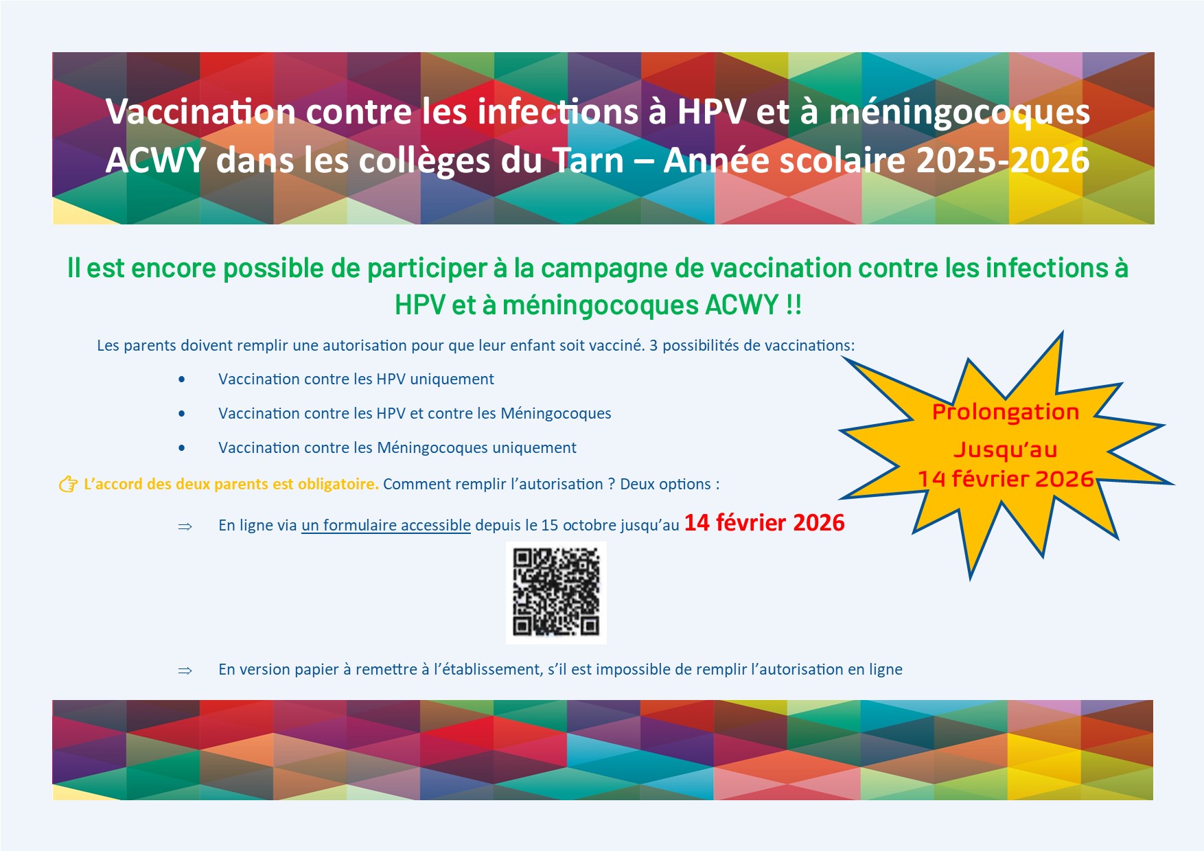 Vous trouverez ci-joint, une communication concernant la prolongation de la campagne de vaccination contres les infections à HPV et à Méningocoques ACWY.